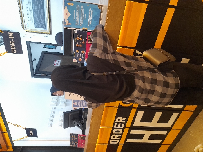 woman in a black hijab and a black and gray plaid shirt standing at a counter in a restaurant. She is looking at a menu board with a "DINE-IN" sign above it. The counter is decorated with yellow and black stripes and the words "ORDER HERE" are written in large white letters. The restaurant appears to be clean and brightly lit. There is another woman, wearing a light blue shirt, standing behind the counter, facing the first woman. She is holding a menu board. The image was taken in Nganjuk, Indonesia.