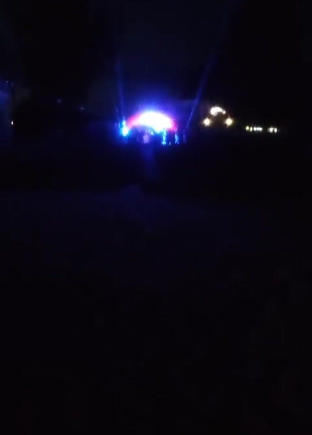 dark scene with flashing blue and red lights in the distance, suggestive of a police or emergency vehicle. There is also some ambient light from streetlights in the background. The ground in the foreground appears to be rough or uneven. Loud music is playing.