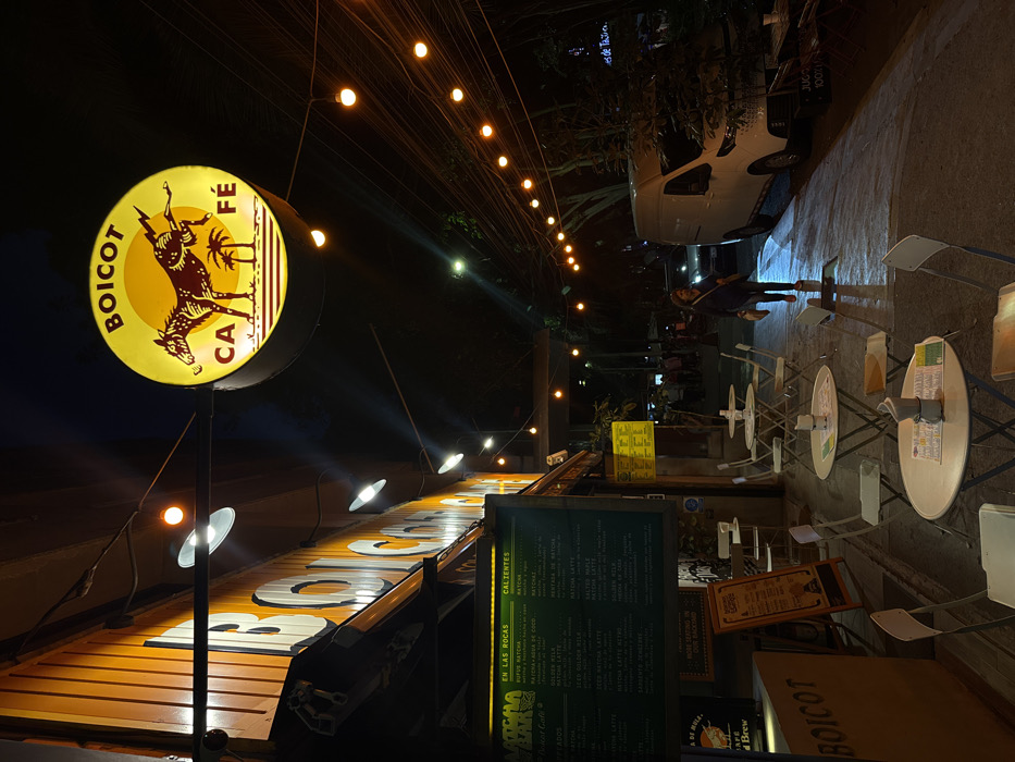This nighttime image captures a street scene in Mexico City, Mexico. The "Boicot Café" is the primary subject on the left, identified by its bright orange facade with large white "BOICOT" lettering and a prominent circular yellow illuminated sign displaying a kicking donkey/horse above two palm trees with the text "BOICOT CAFÉ." Two large, dark green menu boards detailing "EN LAS ROCAS" and "CALIENTES" selections are affixed to the cafe wall. The foreground and midground sidewalk area features multiple small, light-colored round tables with matching folding chairs, arranged for outdoor dining. One table in the immediate foreground displays a metallic Moka pot and several printed papers. Illumination is provided by sconce lights mounted on the cafe facade and numerous warm yellow string lights strung across the street overhead. An adult female, dressed in dark clothing and carrying a light-colored bag, walks on the paved sidewalk in the middle ground, moving towards the right side of the frame. Her shadow is cast ahead of her. Further down the street in the background, several indistinct human figures are visible. A white panel van is parked on the street to the right, facing away from the camera, partially obscuring a dark-colored car behind it. Dense overhead electrical wiring is visible against the dark sky, and trees and foliage line the right side of the street, suggesting an urban environment with natural elements.