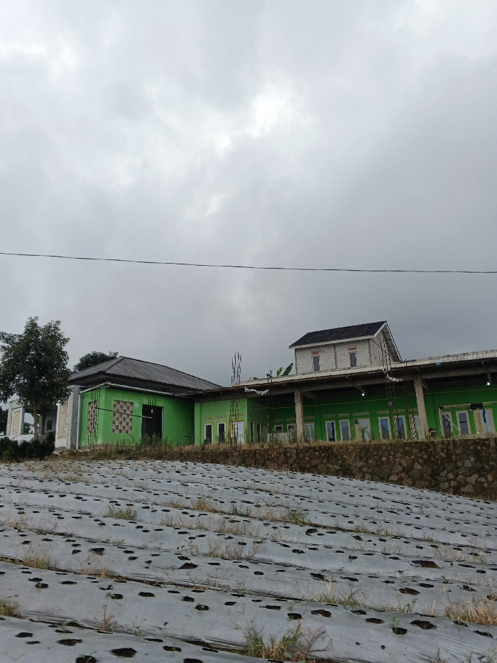 The image displays an overcast daytime scene in Kabiufa, Papua New Guinea. In the foreground, an agricultural field slopes gently upward, covered with a light grey or white plastic mulch system, exhibiting regularly spaced perforations through which small clusters of vegetation are visible. A dark, mortared stone retaining wall borders the upper edge of this field. Situated on a raised embankment beyond the wall is a multi-section building complex. The dominant structure is a single-story building painted a vibrant lime green, featuring multiple rectangular windows and doors, and capped with a dark grey pitched roof. To its right, an adjoining section, likely under construction or renovation, presents a two-story appearance with exposed light-colored masonry on the upper floor and a dark pitched roof. This section also incorporates a lower, flatter roof supported by columns, creating a covered veranda over ground-level windows. Vertical metal rebar rods extend from various points on the newer construction. A dense green tree stands to the far left of the main building. The background is dominated by a uniform, grey, cloudy sky. A single black wire or cable stretches horizontally across the upper-mid section of the frame. No individuals are present in the scene.