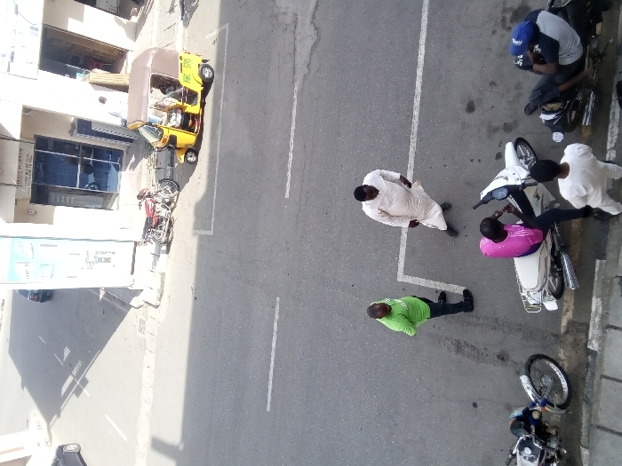 An overhead forensic view depicts a daytime street scene in Fagge A, Nigeria. The asphalt road, marked with white parking lines and lane dividers, features several individuals and vehicles. On the right, a light-colored building with blue-tinted glass doors and windows stands behind a sidewalk. A red motorcycle is parked on the sidewalk near the building. A yellow tricycle (keke Napep) with a brown canopy is parked on the street by the sidewalk; an individual is partially visible inside. Six adult males are present on the road. One man in a lime green polo shirt and dark pants stands facing away from the camera. Adjacent to him, a man in a white traditional garment stands facing left. Further in the foreground, a man in a pink t-shirt and dark pants is seated on a white scooter, looking downward. Another man in a white traditional garment stands near the scooter, facing away. A fifth man, wearing a blue cap and light-colored shirt, is positioned over a dark motorcycle parked on the road, appearing to rest. A second dark motorcycle is partially visible in the lower left. In the upper left, a dark-colored car is partially visible on the main road, receding into the distance.