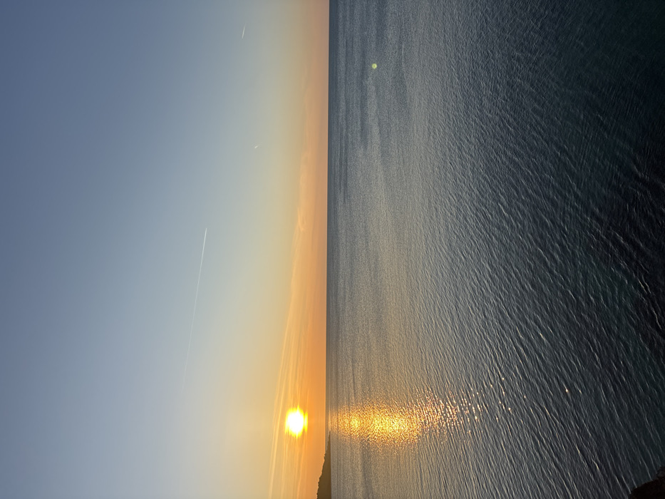 A vertically oriented view shows a sunset over water. The left side of the image displays a clear blue sky transitioning into an orange hue where the sun is setting. Two vapor trails stretch across the sky. The right side depicts water, reflecting the sunlight. The water's surface is textured with gentle ripples. The colors of the water gradually darken from golden near the sun's reflection to deep blue further away.