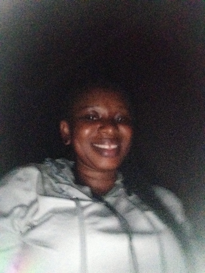 A woman smiles in dim light. She is wearing a light gray hoodie. Her skin is visible, and her teeth are showing as she smiles. The background is dark and blurry, suggesting a nighttime or low-light setting. The image appears to be a selfie or a close-up taken in a potentially challenging lighting situation.