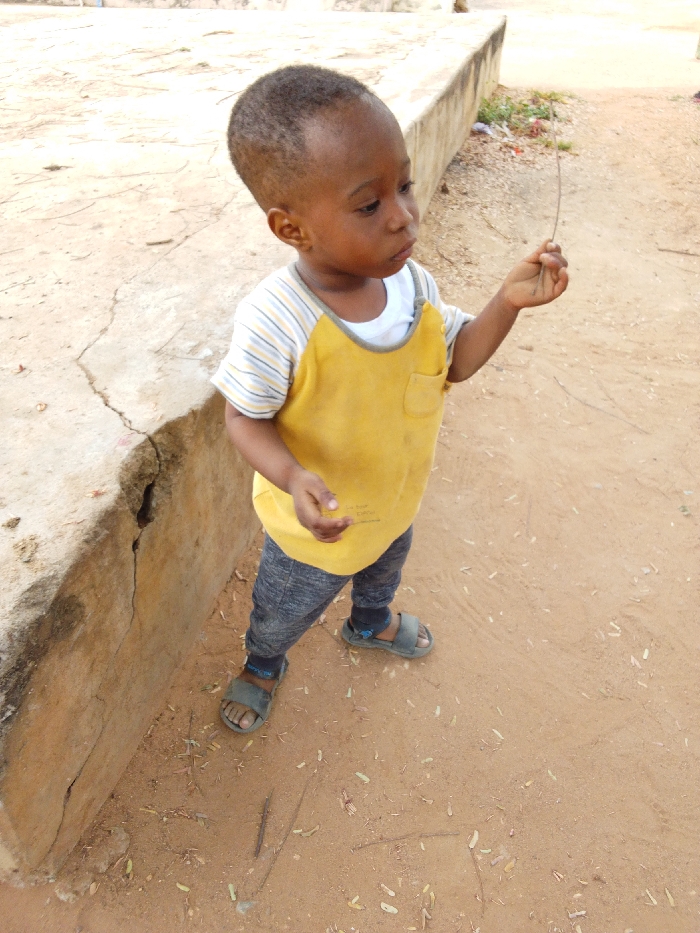 A young child, approximately 2-3 years old, stands outdoors in Adankolo, Nigeria, looking towards the right of the frame with a neutral expression