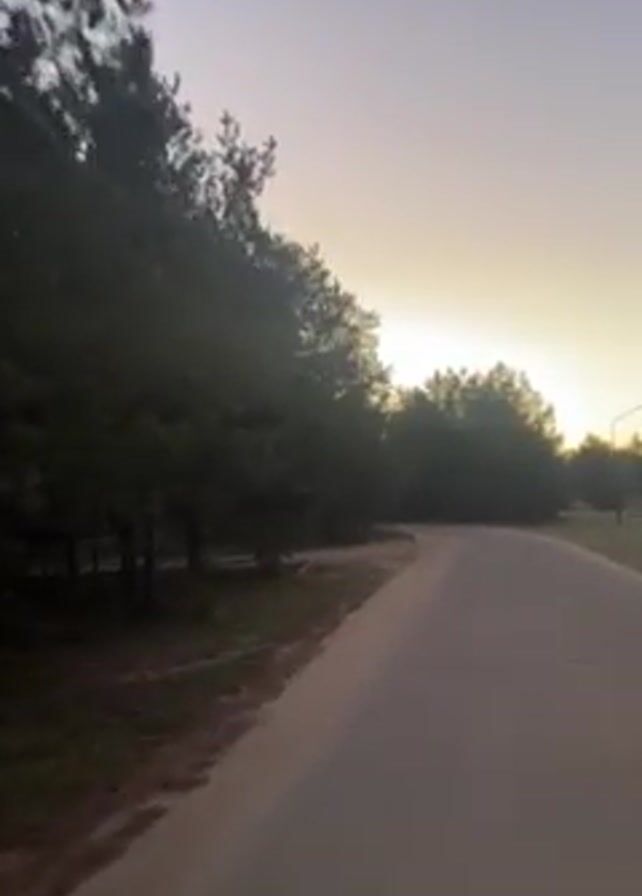vehicle traveling on a paved road through a forested area at what appears to be dusk or dawn, given the soft lighting and golden hues in the sky. Trees line the road on both sides, and the perspective is from within the vehicle, possibly from the dashboard or slightly higher, showing part of the vehicle's hood. The road curves gently to the right in the distance. The atmosphere seems tranquil and quiet, with no visible people or other vehicles in sight.