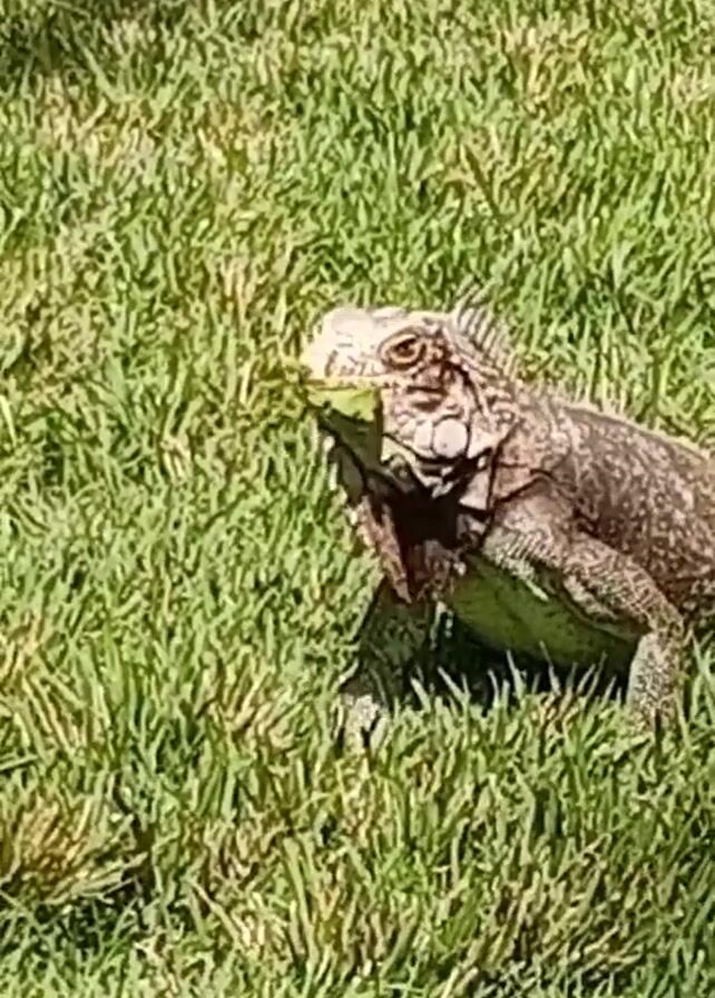 An iguana stands in the middle of a patch of bright green grass. The reptile has a gray, brown, and white mottled pattern and large eyes. It looks towards the left side of the screen, with a green leaf tucked inside its mouth. The iguana’s spine and dewlap are both visible. The sunlight adds highlights to the iguana’s scales, giving it a somewhat shiny appearance.