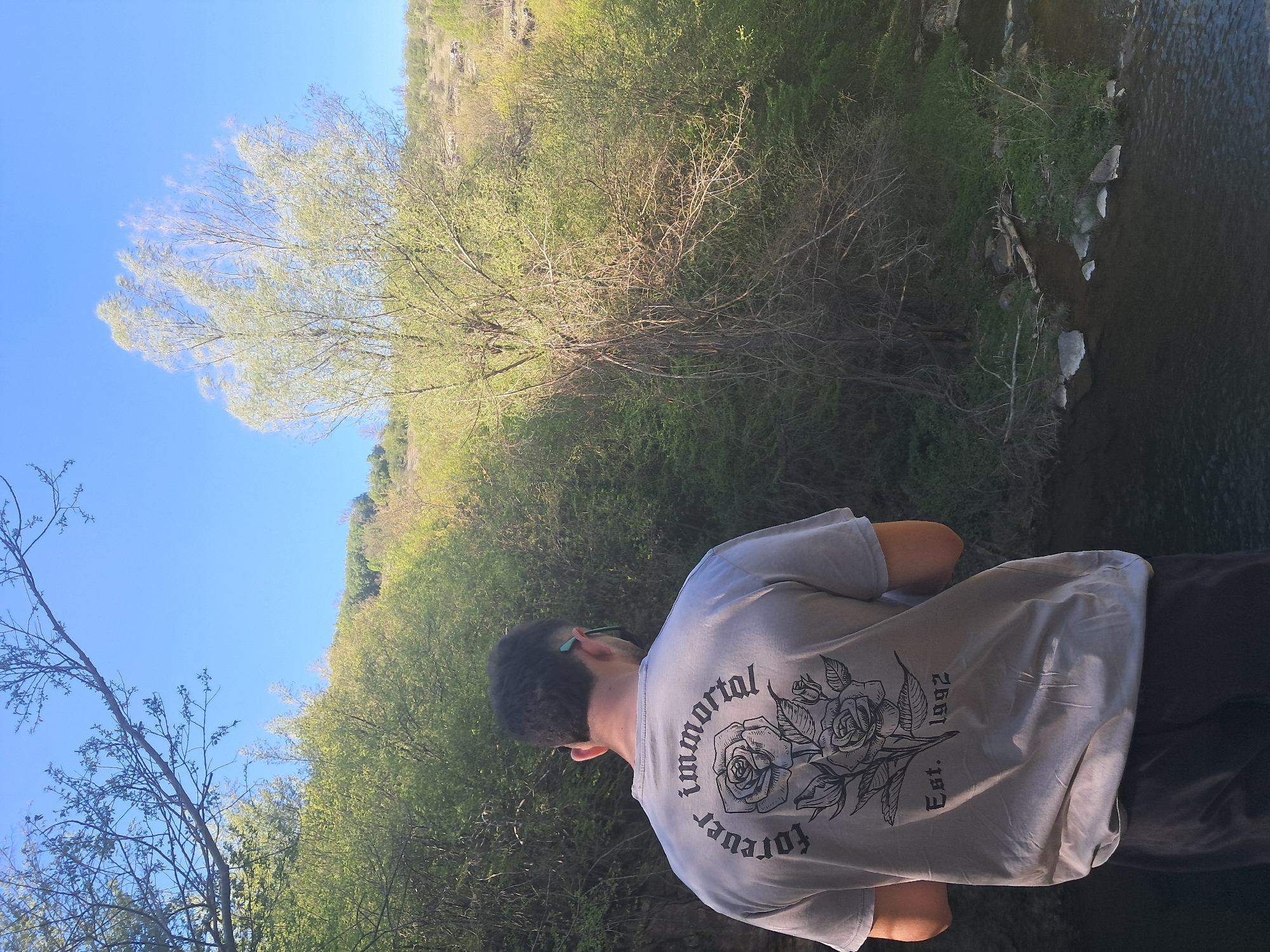 A man stands near a river in a natural setting, presumably in Solari, Bulgaria, based on the prompt. He is wearing a light grey t-shirt with a floral design and the words "immortal forever Est. 1992" printed on the back. He is facing the river, with trees and shrubbery visible on the riverbank and in the background. The sky is blue and partly visible through the branches of a tree. The man has dark hair and is wearing glasses with green accents. He is standing with his arms crossed. The river flows along the right side of the image, with some rocks and vegetation visible along its edge. The scene appears to be outdoors, likely in a park or nature reserve.
