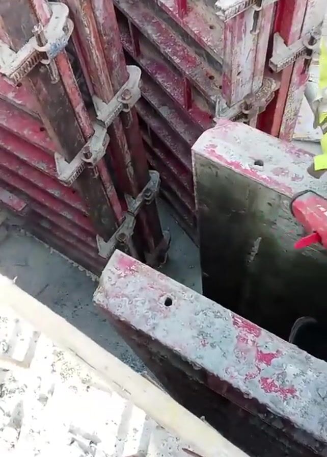 A construction worker in a neon yellow jacket and blue undershirt uses a red pneumatic nailer to secure a wooden form to the concrete. He then tucks the tool into his pocket. Several pieces of metal rebar are visible sticking up from the concrete, and the formwork is painted red. The worker wears a beanie and work gloves.
