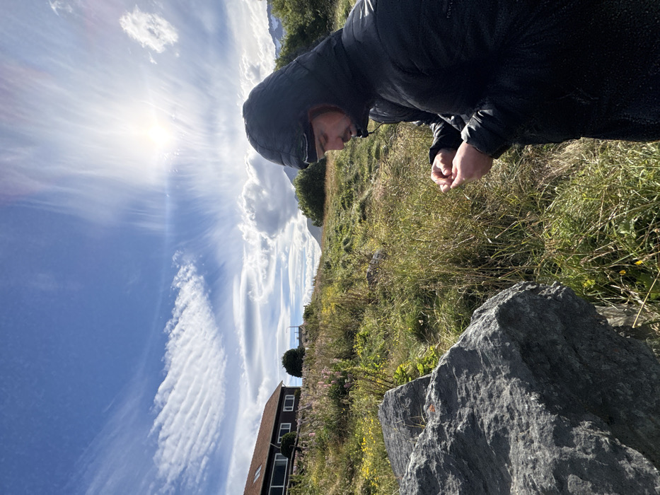 - "A person wearing a black hooded jacket looks down at a rocky landscape, with tall grass and wildflowers" by FM-uVwPE3, licensed under CC BY 4.0