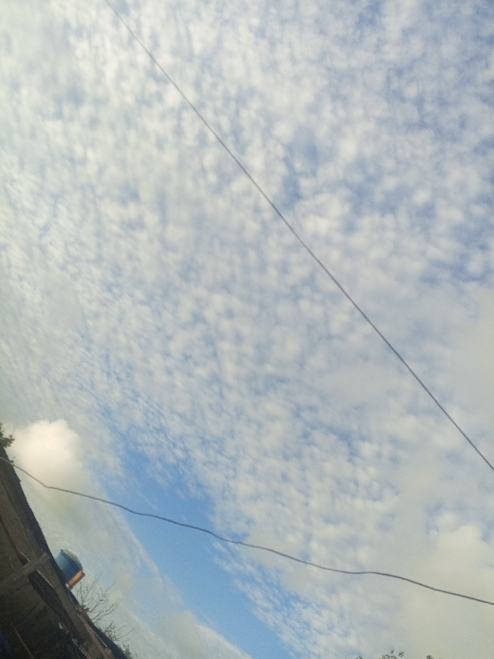 vast expanse of sky filled with wispy, textured clouds. Two power lines cut across the scene diagonally. In the bottom left corner, there is a glimpse of a building with a blue water tank, suggesting an urban or suburban environment. Some trees are barely visible. The color palette is primarily blue and white, characteristic of daylight conditions.