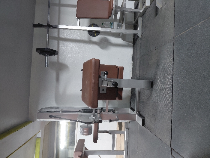 gym equipment. There is a weight machine with brown padding and silver metal supports. To the left, a barbell with weights is leaning against the wall. The floor is covered with black rubber mats. A water bottle sits on top of the machine. The equipment is in a room with white walls and a window.