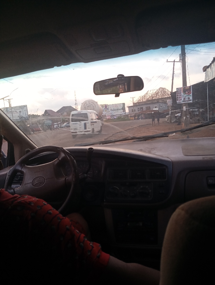 This image depicts a view from inside a vehicle, looking outward through the front windshield. The vehicle's interior shows a partial view of a steering wheel with a Toyota emblem, dashboard components, and a rearview mirror. A human arm, covered by a red, patterned long-sleeved garment, is visible in the lower left foreground. The exterior scene portrays a major road or intersection within the city of Enugu, Enugu State, Nigeria. A white commercial passenger van, consistent with a Toyota Hiace, is centrally positioned, traveling away from the viewer. Behind it, a dark-colored SUV or truck is partially visible. To the left of the road, a large billboard prominently displays images of two male political figures, identified as Barr. Peter Mbah and Ifeanyi Ossai, with the text "ENUGU STATE" clearly legible, confirming the geographical location. Further in the background, a multi-story building with exposed roof trusses indicates ongoing construction. A large, spherical white object, possibly an inflatable advertisement or water tank, is situated in the mid-ground; faint text starting with "GOODL" is discernible on its surface. On the right side of the road, a series of single-story commercial structures with corrugated metal roofs line the thoroughfare. Utility poles carrying numerous overhead wires are present on both sides of the road. Several pedestrians are visible walking near the commercial buildings on the right. The sky is a pale blue with hazy white clouds, suggesting late afternoon or early evening ambient light.