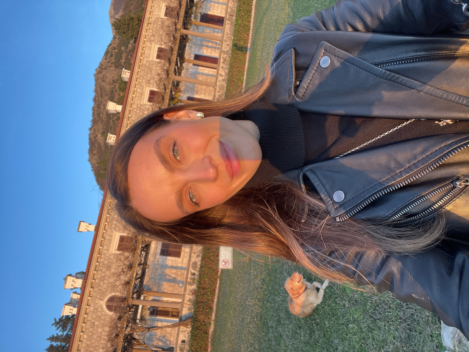 The image displays a female individual taking a selfie outdoors during golden hour, set against a backdrop consistent with a historic property in Sveti Stefan, Montenegro. The primary subject is a woman with long, dark brown hair and light blue eyes, positioned in the foreground, looking directly at the camera with a slight smile. She wears a black leather jacket over a black turtleneck shirt, accessorized with a silver chain necklace and small stud earrings. Warm, low-angle sunlight illuminates the right side of her face, casting a distinct shadow on the left. To her left, in the midground, a light-brown dog, consistent with a Golden Retriever, lies on manicured green grass, its mouth slightly open, also bathed in the warm sunlight. The background features a large, multi-story building constructed of light-colored stone, possessing a reddish-tiled roof with multiple chimneys and a covered walkway or pergola with bare vines, supported by columns along its facade. Behind the building, a large, barren mountain rises under a clear blue sky. A small, partially obscured white sign with red markings is visible on the grass near the building's base.