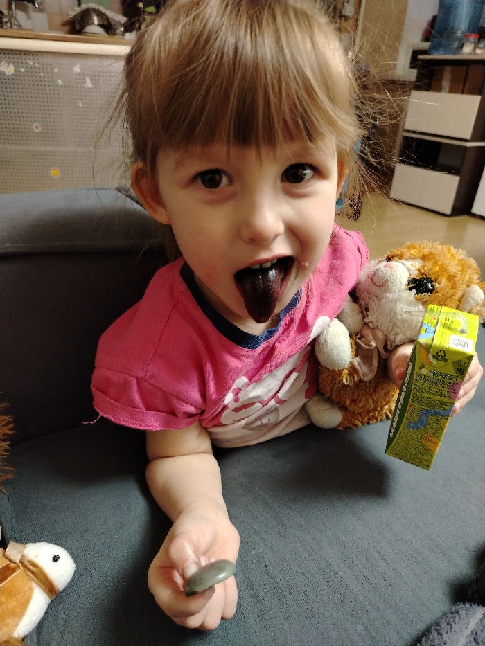 A young child is depicted seated indoors on a dark grey upholstered surface, in what appears to be a residential setting within the city of Chaikovsky, Russia. The child, with light brown hair and bangs, is wearing a pink short-sleeved t-shirt and looking directly at the camera, smiling while extending a dark purple-black tongue. The child's visible left hand holds a small, smooth, dark grey, oval-shaped object. The child's right arm embraces a brown and white plush animal toy, while their right hand holds a small green and yellow juice carton bearing Cyrillic text, consistent with a product like "Фруктовый Сад" (Fruktovy Sad). A second, smaller white and brown plush toy is partially visible in the lower-left foreground. The background reveals an interior space with a light-colored shelving unit or cabinet on the left and a white two-tiered storage unit topped with a large blue water cooler bottle on the right.