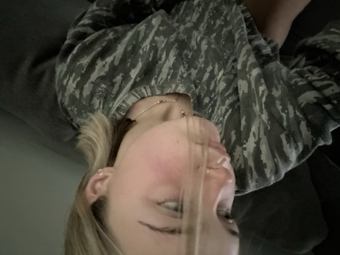 A young individual with blonde, chin-length hair is depicted in a close-up, chest-up indoor shot. She wears a long-sleeved shirt featuring a camouflage-like pattern in shades of grey, olive green, and off-white. A thin, delicate necklace with small metallic elements is visible, and she has small stud earrings in both ears, along with a subtle stud piercing on her left nostril. Her skin is fair, with a visible flush or redness on her right cheek. She is looking towards her right (viewer's left) with a neutral expression and slightly parted lips. The individual is positioned against a dark grey upholstered surface, likely a sofa or chair. The background consists of a plain, light-colored wall. The lighting in the scene is dim. The indoor setting does not provide specific geographical identifiers for a precise location within Vancouver, Canada.