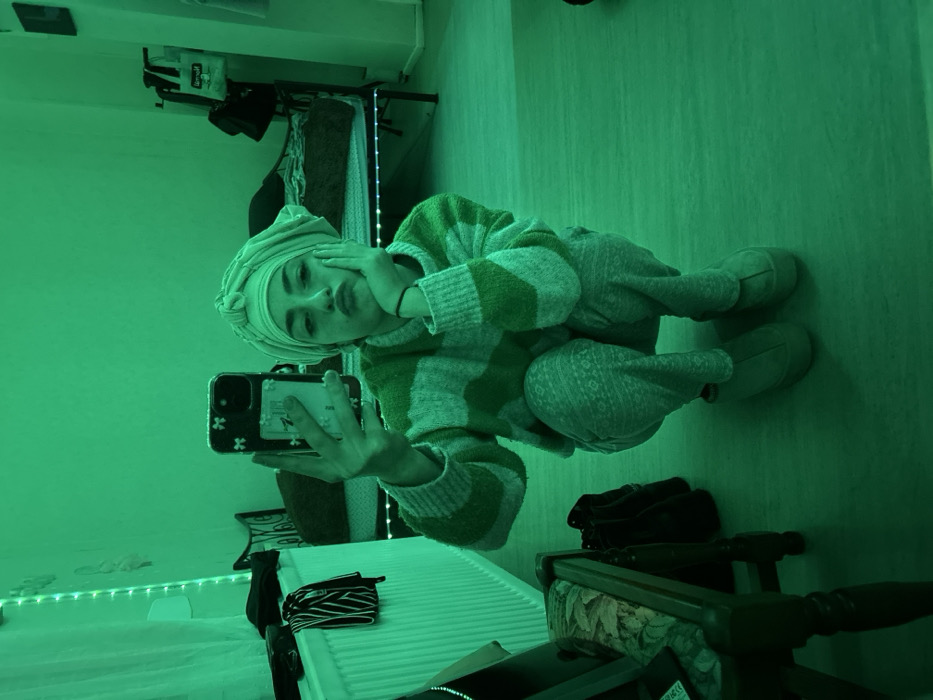 The scene is a room in Strasbourg, France, illuminated entirely by a pervasive green light, likely from LED strips visible along a wall. A young individual is centrally positioned, crouching on a light-colored floor, taking a selfie. They are wearing a light-colored headwrap, a horizontally striped long-sleeved sweater (light green and off-white), patterned light-colored trousers, and light-colored slip-on shoes. A black smartphone, equipped with a decorative case featuring clover shapes and what appears to be a card holder, is held in their left hand and aimed towards themselves. Their right hand rests on their chin, and they exhibit a pouting facial expression. In the left background, a white radiator is partially visible, with dark, striped clothing draped above it. A wooden side table with a patterned top is partially present in the lower-left foreground. In the right background, a dark metal bed frame with dark bedding is visible, with a string of green LED lights positioned along the wall above it. A white tote bag with text and a dark bag are hanging on the wall in the upper right.