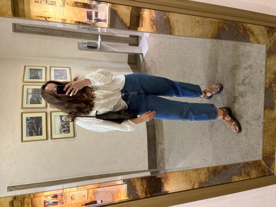 A female subject is depicted in a mirror selfie taken indoors. She stands centrally, wearing a white long-sleeved shirt, blue jeans, and brown strappy sandals. A dark-colored shoulder bag hangs from her left shoulder. Her face is partially obscured by her long brown hair and a black smartphone held in her right hand for the photo. The flooring is a light gray, patterned carpet. Behind her, a light-colored wall features six framed pictures arranged in two rows of three. These artworks depict scenic views, including the distinctive Brückenhäuser (Bridge Houses) of Bad Kreuznach, Germany. To the left in the mirror's reflection, a display board shows various images and a wine bottle poster, with the number "3" visible twice. To the right, a silver, free-standing hand sanitizer dispenser is reflected. The setting is a public or semi-public interior space within Bad Kreuznach, likely a hotel lobby, museum, or tourist information center, given the prominent display of local landmarks and the presence of a hand sanitizer station.