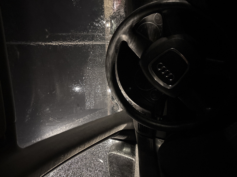 The image captures an internal perspective from an Audi vehicle, identified by its steering wheel emblem, looking outward through a windshield and driver's side window