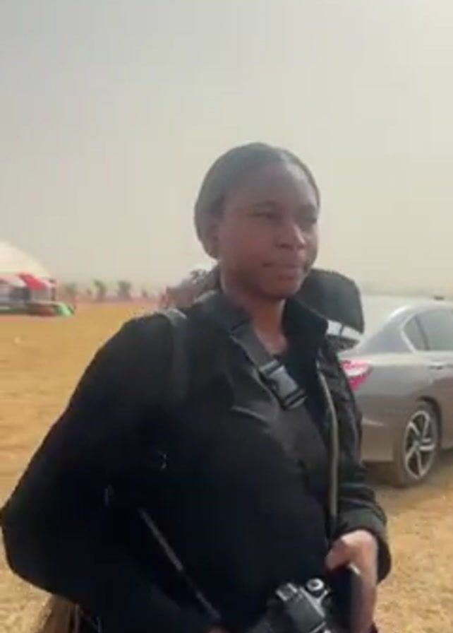 A young woman stands in a dry, grassy field, making a peace sign with her left hand. She is wearing a black jacket over a black shirt, khaki pants, and has a backpack slung over her shoulder. She is also wearing a camera around her neck. Her hair is braided and pulled back in a ponytail. Behind her, a man is walking away from a silver car with its trunk open. The woman then turns to her right and takes a picture of an old, dirty truck. There are tents and other structures visible in the background. The sky is hazy.
