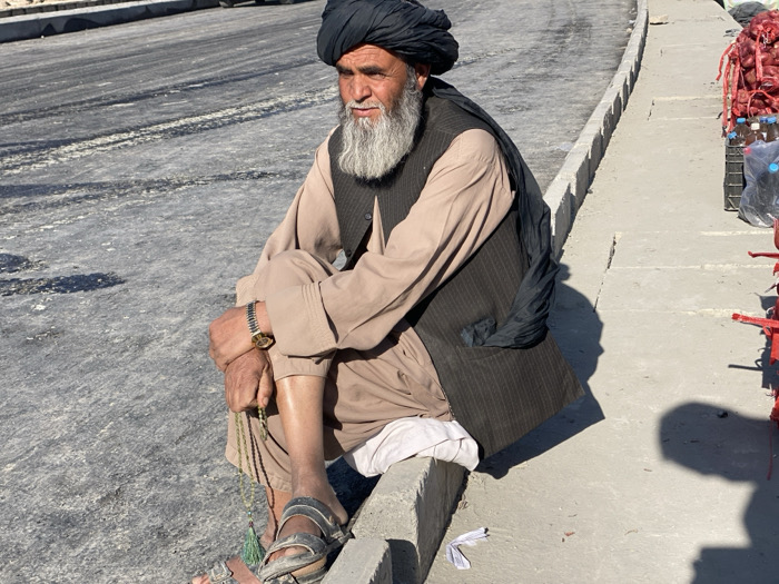 - "An elderly man is seated on a concrete curb at Gundigan Village, Afghanistan" by FM-B5wmg2, licensed under CC BY 4.0
