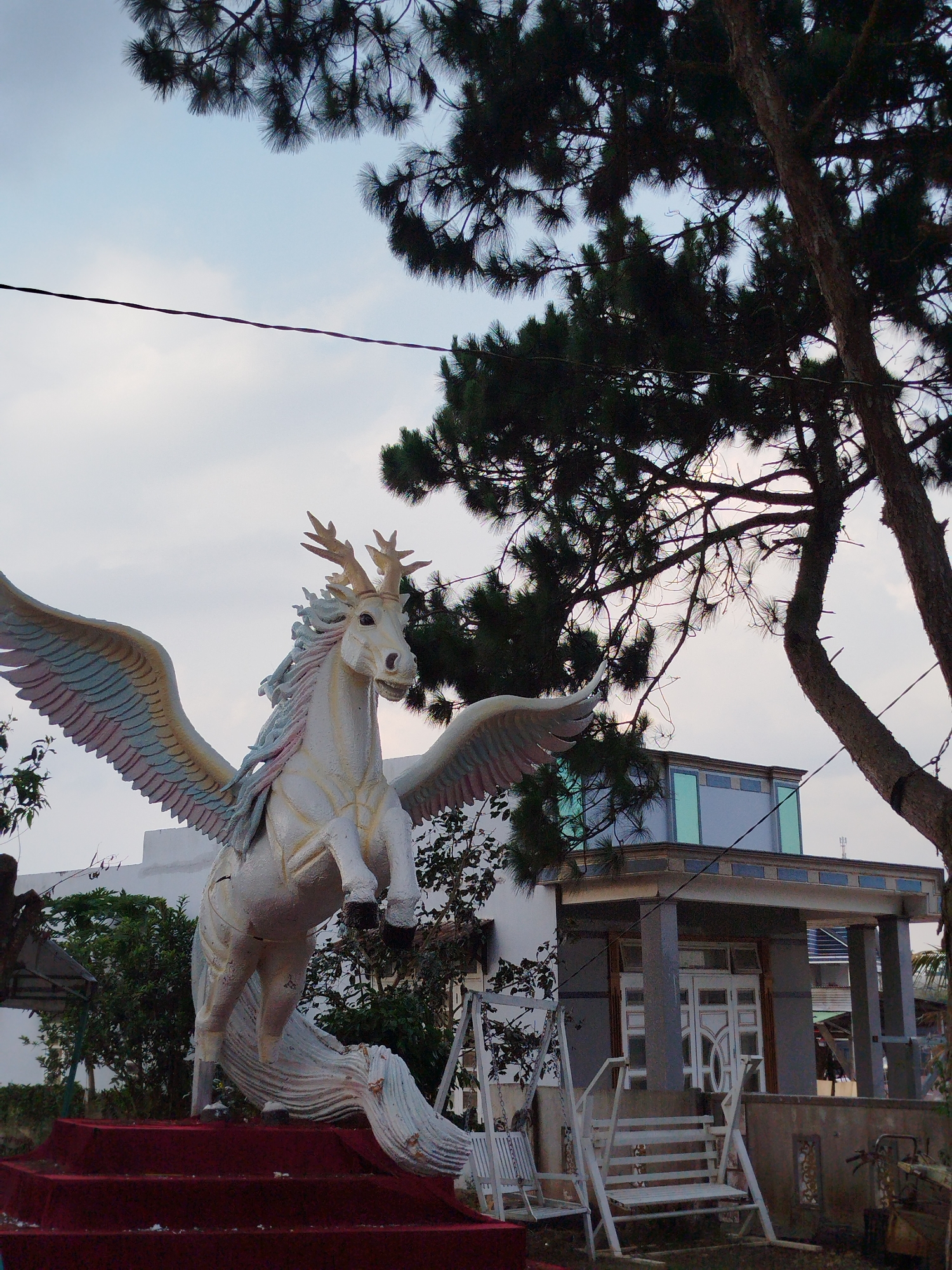 A statue of a white horse with rainbow-colored wings and antlers stands on a red-carpeted staircase. Behind the statue is a building with gray columns and a white door. A swing and bench sit in front of the building. Pine trees frame the image, obscuring the sky. The location is Krăng Chớ, Vietnam.