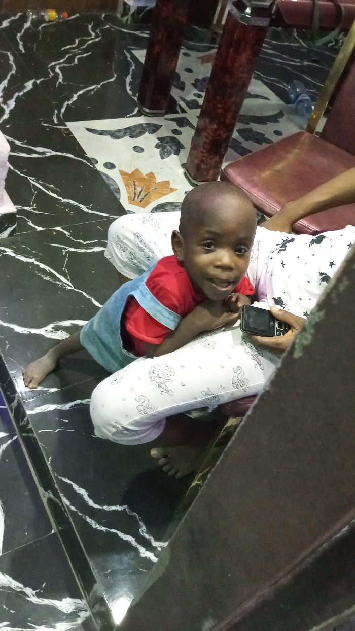 An indoor setting within the city of Unknown, Unknown, features a young child, approximately a toddler, with dark skin and a bald head