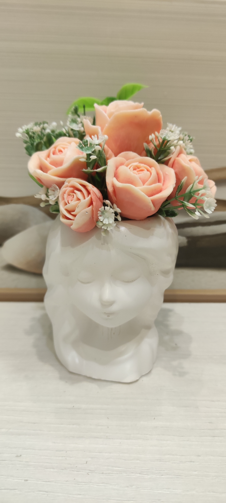 A white ceramic head vase filled with peach-colored roses and small white flowers sits on a white wooden surface