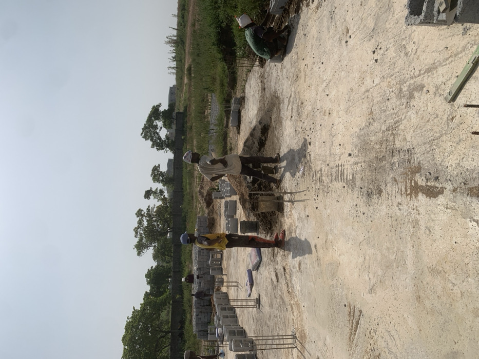 The image displays an active outdoor construction site in Karsana 2, Nigeria, under a clear, bright sky