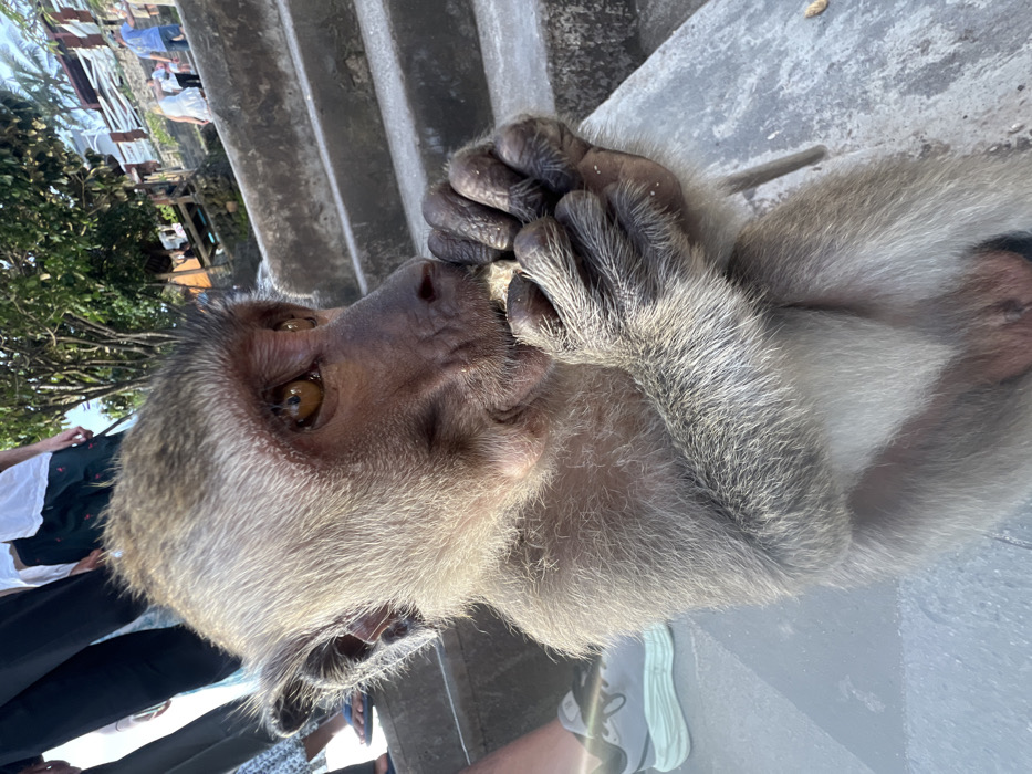 - "A macaque monkey is depicted in the foreground, seated on a gray concrete surface, actively consuming a small, light-colored food item held in both hands" by FM-xgQP92, licensed under CC BY 4.0