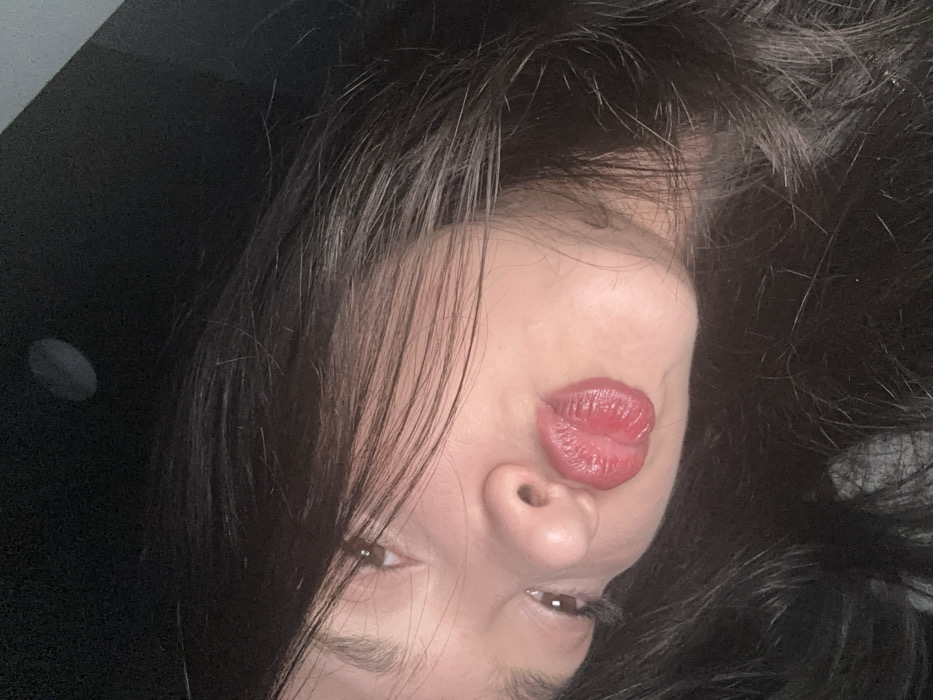 A person's face is tilted with pursed red lips, a small nose, and dark hair framing the face