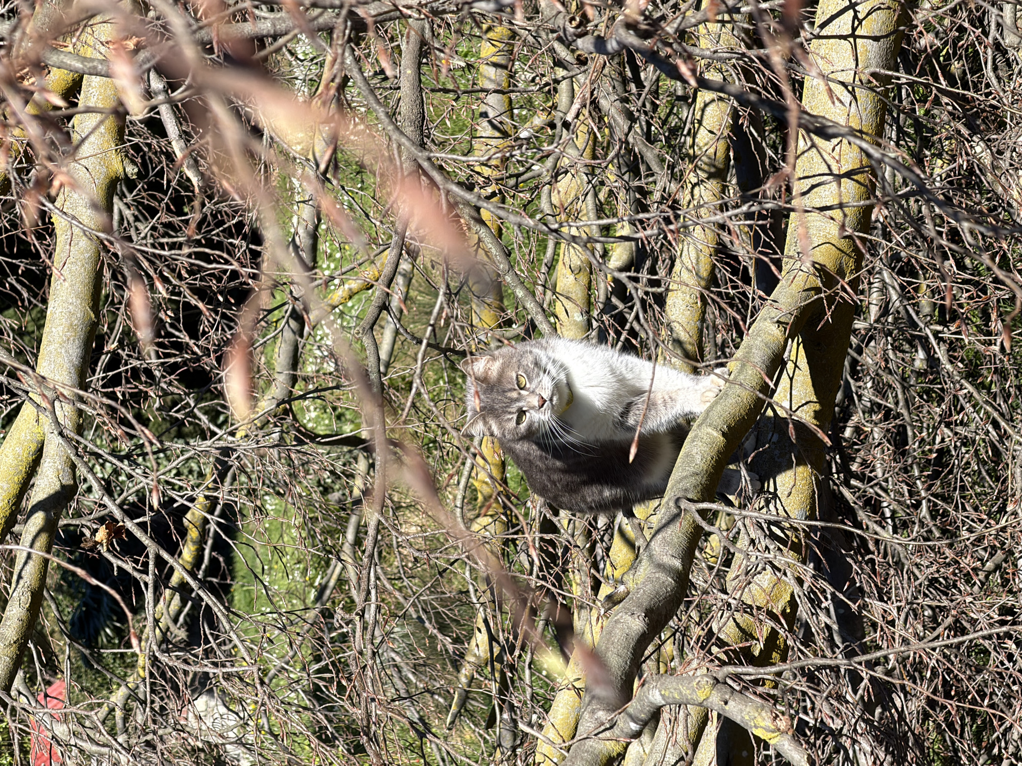 - "A grey and white domestic cat with yellow-green eyes and a light-colored collar is positioned centrally, standing on a thick, horizontal tree branch covered in yellowish-green lichen or moss" by FM-fbqYv1, licensed under CC BY 4.0