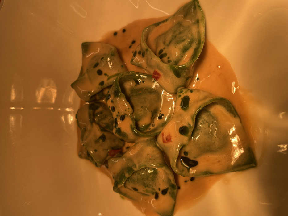 The image presents a close-up, overhead view of a food dish, depicting a scene from within the city of Saint Petersburg, Russia, although specific site details are not visually discernable from the frame. Six pieces of pasta, consistent with tortelloni or agnolotti, are arranged centrally in a white, shallow, wide-rimmed bowl. The pasta dough is a marbled green and yellow-orange, folded into irregular, roughly triangular or crescent shapes, and coated in a creamy, vibrant orange-yellow sauce. Small, irregular black specks, resembling seasoning or oil droplets, are distributed across the sauce and pasta, alongside a few visible bright red fragments, possibly chili flakes or diced pepper. Warm, artificial lighting reflects off the glossy surface of the plate, indicating an indoor environment, likely a restaurant or dining area. No individuals, specific actions, or interactions are visible within the frame; the focus is exclusively on the prepared meal.