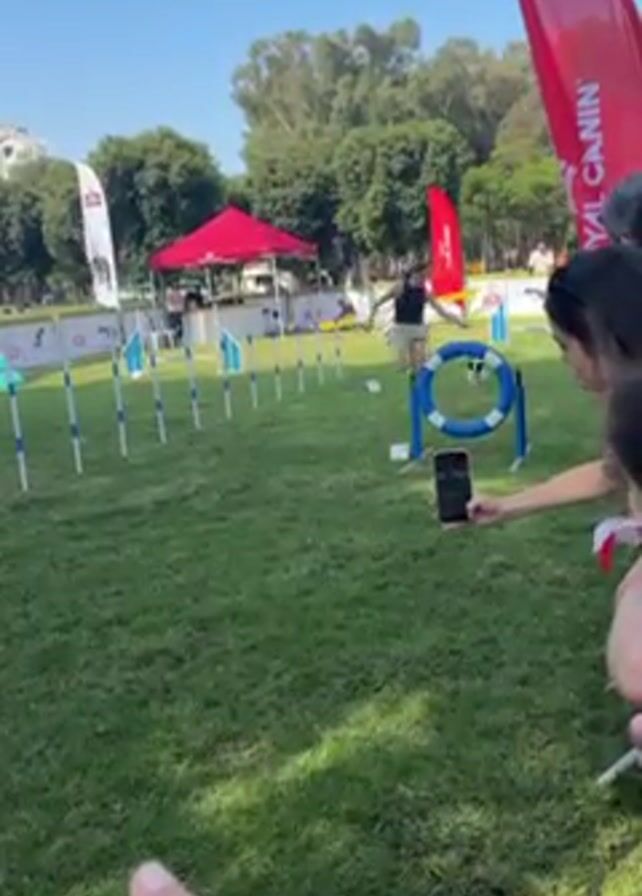 A woman and a dog are participating in a dog agility course. The woman is wearing a black tank top and a light-colored skirt, and she is running alongside the dog. The dog is white and small. They are navigating through various obstacles, including poles, a hoop, and a tunnel. The course is set up on a grassy field, and there are several people watching. There are also banners and flags, some with the words "Royal Canin" visible. The video is shot from the perspective of a spectator. The day is sunny.