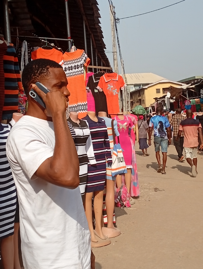 This image depicts an outdoor market scene in Fegge, Nigeria, during daylight hours. In the left foreground, a dark-skinned male, estimated to be between 20 and 30 years old, wearing a plain white short-sleeved t-shirt, is shown in profile, speaking into a grey smartphone held to his right ear with his right hand. To his right, a line of headless female mannequins displays various articles of clothing, including striped dresses (black and white, navy and red), orange tops, a pink dress, and a black top. Several mannequins exhibit bare lower legs and light-colored flat shoes. Behind these mannequins, additional clothing items, such as patterned orange dresses and striped tops, hang from racks beneath a corrugated metal roof structure. The ground is unpaved earth. In the mid-ground and background, several dark-skinned individuals are observed walking away from the camera through the market area; one male wears a blue t-shirt with a graphic design and denim shorts, while another wears a plaid shirt and trousers. Visible in the background are various urban buildings, including a prominent two-story yellow building with a white roof, and a dark utility pole with overhead wires on the right.