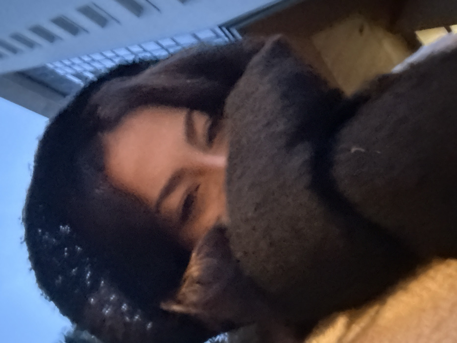 The photo depicts a person with fair skin, dark hair, and closed eyes. The person is heavily wrapped in a dark, bulky fabric, possibly a thick scarf or shawl. In the background, a building with multiple windows is visible. The overall lighting is soft and muted, suggesting an indoor setting or overcast day. The angle is slightly tilted, giving a casual, intimate feel.