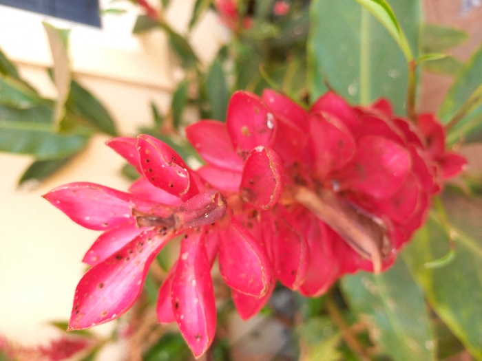 The image captures a close-up view of a conical, vibrant red inflorescence within the city of Oturkpo, Nigeria. The plant structure is composed of numerous layered, imbricated bracts, with the uppermost layers partially unfurled, revealing a darker, slender central element. The surfaces of the bracts exhibit numerous small, dark brown or black specks, indicative of insect activity or environmental debris. Scattered minute white specks are also visible. Blurred green foliage surrounds the main subject, set against a soft, out-of-focus background displaying muted green and light beige tones, consistent with an outdoor garden or natural setting under ambient daylight. No human figures are present.