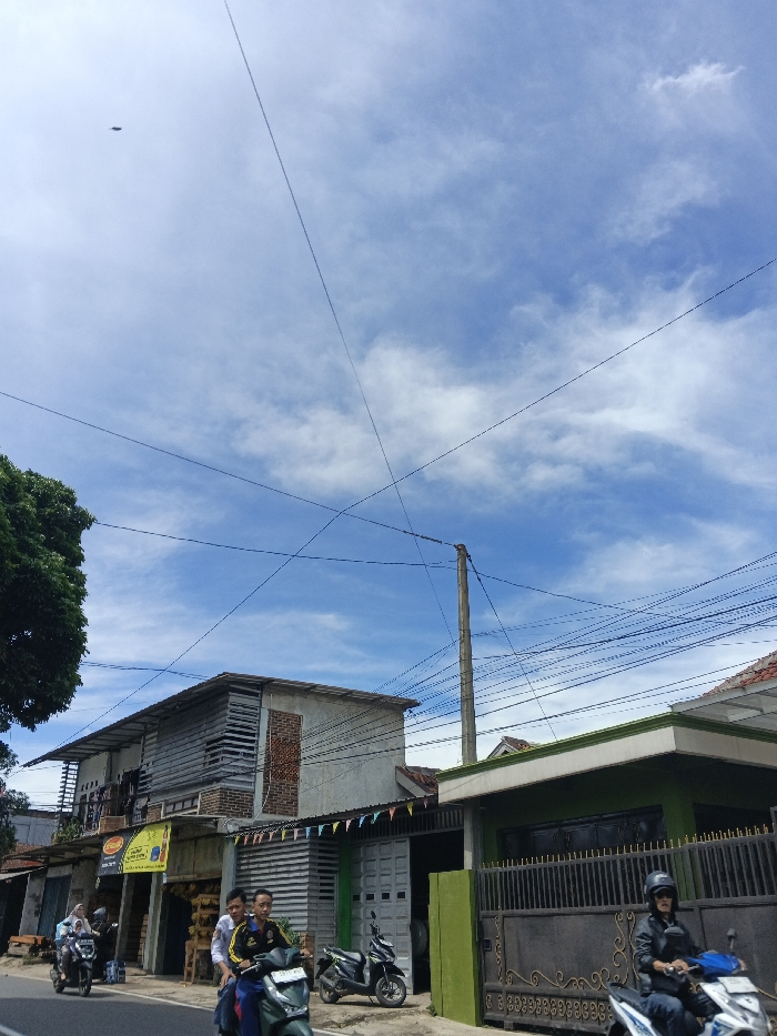A street scene shows several buildings, including a two-story structure with horizontal slats on the upper level. Utility poles and wires crisscross the blue, cloudy sky. A small black object is visible in the upper left portion of the sky. Motorbikes are on the street with people riding them. A green painted door is adjacent to a decorative fence.