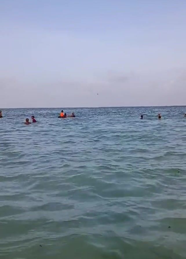 The video depicts a group of people swimming in the ocean under a clear sky. There are at least eight individuals visible in the water, some standing and others swimming. One person is wearing an orange life vest. The water is turquoise and has gentle waves. In the distance, a hazy shoreline is visible.