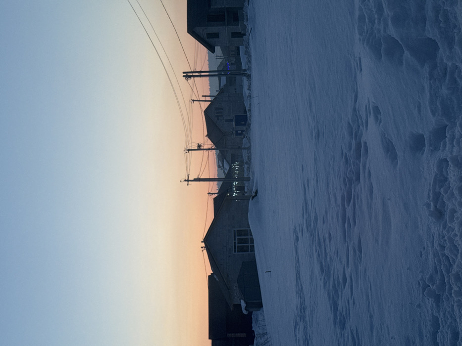 This image depicts a static, wide-angle view of a residential area in Горный, Russia, during twilight. The sky exhibits a gradient, transitioning from a light blue at the zenith to a soft orange and pink hue near the horizon line. The foreground is entirely covered by a thick, uneven layer of snow, displaying numerous depressions and footprints, suggesting recent movement across the field. In the midground, several residential structures are visible, largely covered in snow or presenting a raw, unfinished appearance. From left to right: a partially obscured dark building; a single-story structure with light grey walls, a dark pitched roof, and a prominent multi-pane window or glass door on its front facade, adjacent to a smaller, dark, shed-like utility structure partially buried in snow; further right, another similar residential building with grey walls and a dark pitched roof. In front of this second building, two blue portable toilets are positioned. The rightmost visible building appears to be under construction, featuring exposed grey wall sections and a dark roof. Multiple utility poles, constructed from wood or concrete, stand across the midground, supporting a complex network of black overhead power lines that crisscross the frame. Artificial lights, appearing warm and yellow, are visible within or around some of the central buildings, suggesting interior illumination or exterior fixtures. In the distant background, a faint line of darker structures and possibly evergreen trees is discernible, with a string of small blue lights visible against the dark distant terrain, potentially decorative. No individuals or active movements are present in the scene.