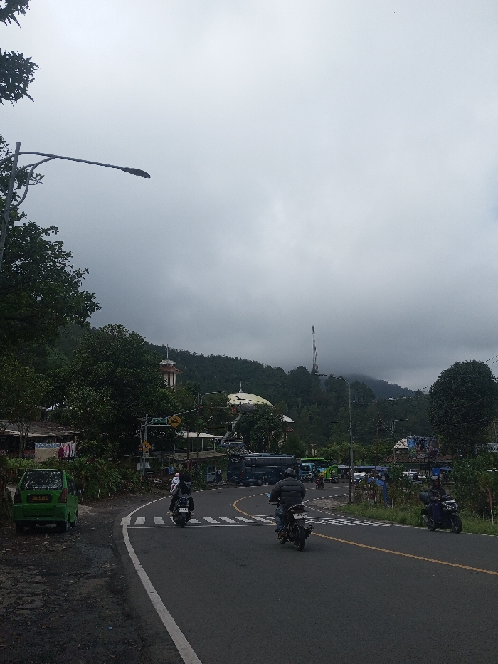 A road curves with three motorcycles traveling on it. A green car is parked on the side. A mosque minaret and dome are visible in the background, along with trees and a telecommunications tower. Several buses and other vehicles are at the intersection. The sky is cloudy and overcast.