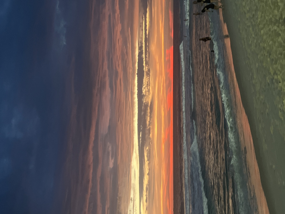 A serene beach scene unfolds beneath a vibrant sky. Dark clouds give way to layers of pink, orange, and yellow hues stretching towards the horizon. Gentle waves roll onto the sandy shore, their crests illuminated by the setting sun. Figures dot the shoreline. The beach transitions from wet sand reflecting the sky to drier sand.