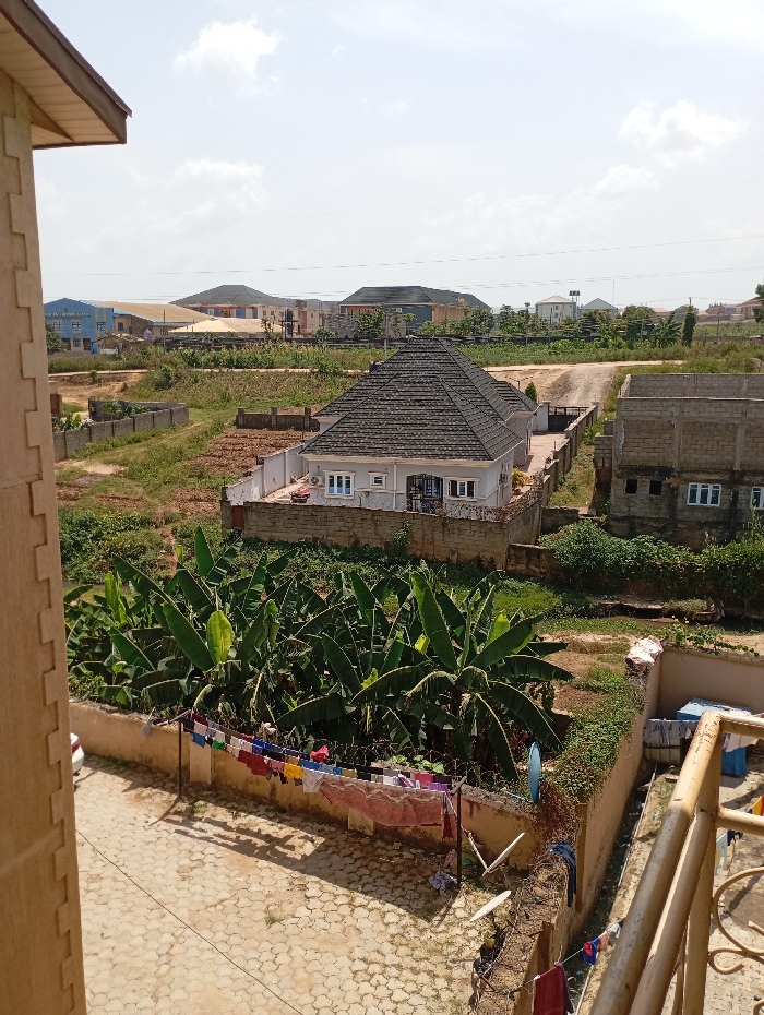 The image displays an elevated, daytime view of a developing residential area in Abuja, Nigeria, under a partly cloudy sky. In the foreground, a light-colored building with a textured, stepped facade is visible on the left. The ground immediately below is paved with grey interlocking concrete pavers, exhibiting shadows suggesting direct sunlight. A makeshift clothesline, constructed from metal poles, stretches across the paved area, holding multiple pieces of colorful laundry drying. Behind this, a low concrete wall topped with barbed wire runs horizontally, bordering a dense cluster of banana plants with large green leaves. To the far right, a yellow-painted metal balcony railing and a satellite dish are partially visible, with another clothesline featuring laundry further right. The midground features a prominent single-story house with a dark grey hip roof and white walls, enclosed by a light-colored perimeter fence. The house has multiple windows with blue-tinted panes. Adjacent to this house on the right is an unfinished two-story concrete structure with exposed block work and blue-tinted windows. Unpaved dirt tracks and patches of dry, sparse vegetation characterize the surrounding undeveloped land. In the background, a mix of completed and partially constructed buildings with various roof styles and colors (including blue and dark grey) are visible under the expansive sky. The overall scene suggests a suburban or peri-urban environment undergoing active development, with a blend of established residences, ongoing construction, and undeveloped plots. No individuals are visible.