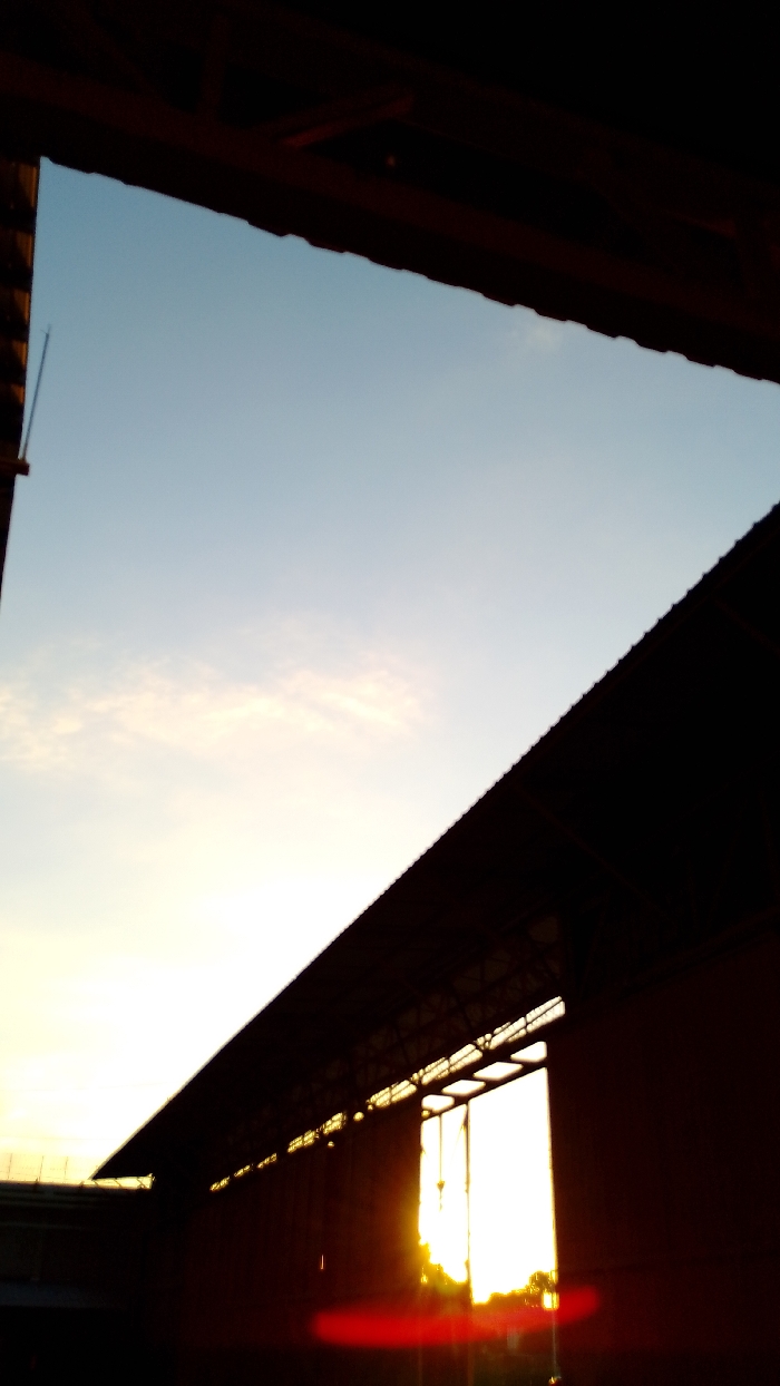 The image depicts a static, backlit scene within the Perímetro Urbano Barranquilla, Colombia, during either sunrise or sunset. The composition is framed by dark, silhouetted architectural elements. The uppermost portion of the frame displays the underside of a dark structure, revealing rafters or support beams. Along the left edge, a partial dark vertical support structure is visible, with a slender, vertical antenna or pole extending upwards against the sky. The right side of the image is dominated by the dark, diagonal silhouette of a large, likely corrugated, roof structure that slopes downwards from the upper right. Below this roofline, a prominent, rectangular opening emits intense, bright yellow-white light, obscuring details beyond except for faint, silhouetted vegetation against the horizon. The sky, visible through the framed opening, transitions from a light blue at the top to a luminous yellow-orange near the horizon, with subtle, elongated cloud formations present in the upper left quadrant. A distinct red horizontal lens flare crosses the lower central portion of the image. No individuals or discernible activity are present in the scene.