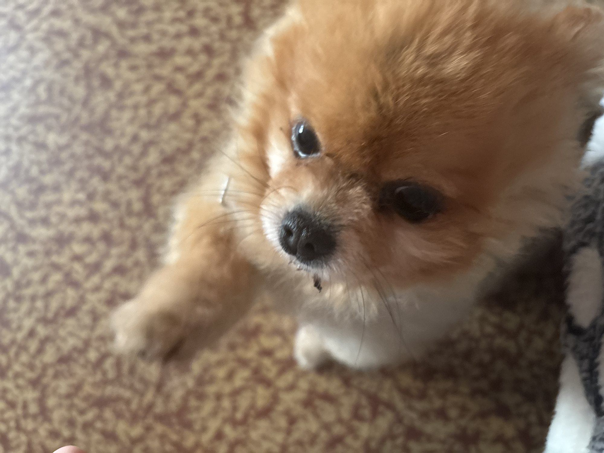 - "A close-up, high-angle shot of a small, fluffy, tan-colored dog, likely a Pomeranian, is the focal point" by FM-DvG102, licensed under CC BY 4.0