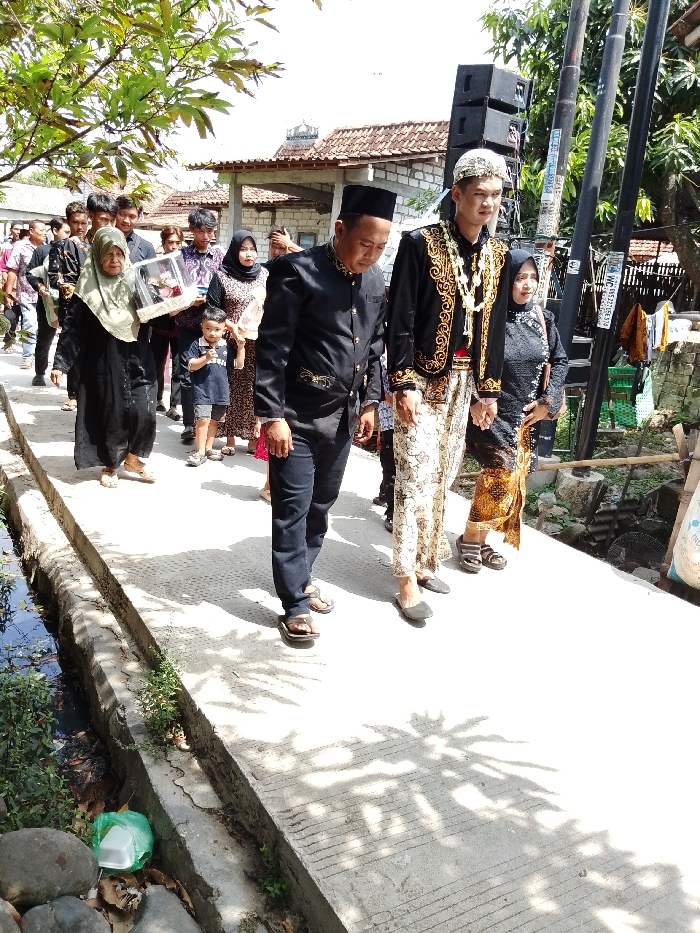The image depicts a daytime procession of approximately 15 individuals walking on a concrete pathway in Juwana, Indonesia. In the foreground, a man in a black traditional suit adorned with gold embroidery and a black peci (cap) walks forward, looking down, wearing brown flip-flops. To his right, a younger man, identified as a groom, wears a black velvet jacket with extensive gold embroidery, a white patterned sarong, a white patterned peci, and a prominent white floral garland around his neck. He is holding hands with a woman to his immediate right, who wears a dark patterned top and a brown patterned sarong, with dark sandals. To the left of the leading man, an elderly woman in a long black dress and a light green hijab carries a rectangular, clear-covered box, possibly a gift or dowry, with a brown base. Behind her, a young boy in a dark t-shirt and shorts, and a woman in a patterned dress and dark hijab are visible, followed by several other adults in a mix of casual and semi-formal attire. The concrete pathway features horizontal grooves and runs parallel to a narrow, concrete-lined drainage ditch on the left, which contains dark water and sparse green vegetation. Scattered litter, including a green plastic bag and a white styrofoam container, is visible near the ditch. Overhead foliage casts dappled shadows across the pathway. In the background, residential structures with terracotta tiled roofs and light-colored walls are present, one featuring a small domed structure on its roof. Two dark utility poles stand on the far right, one fitted with stacked black speakers and attached papers. The scene is brightly illuminated by direct sunlight.