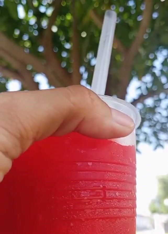 - "A person holds a red, icy drink with a straw in a plastic cup against a background of trees and a bright sky" by FM-Ov7T13, licensed under CC BY 4.0