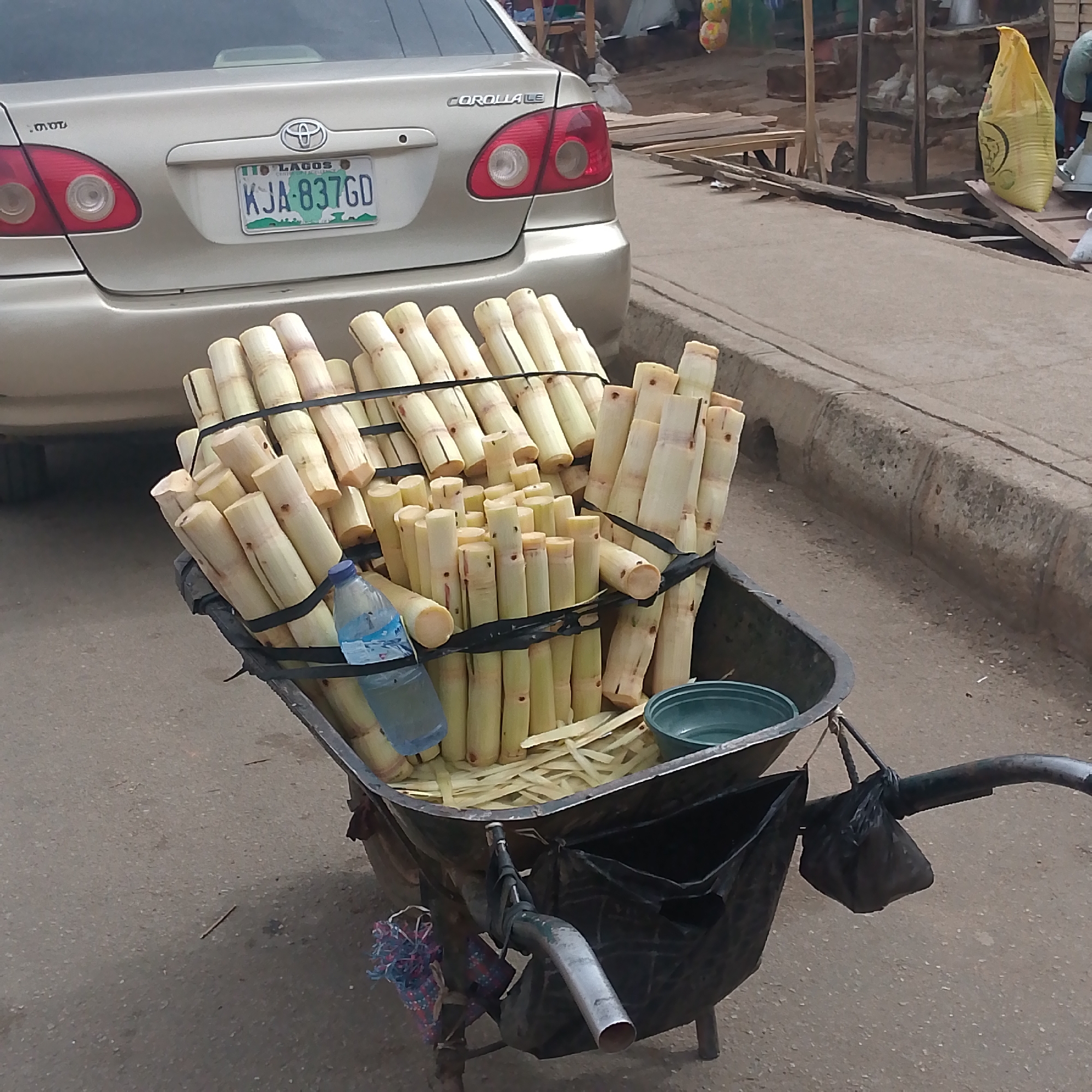 - "A wheelbarrow overflowing with bundles of peeled sugarcane is parked on a paved street beside a silver Toyota Corolla with license plate KJA-837GD, indicating registration in Lagos, Nigeria" by FM-AqNa62, licensed under CC BY 4.0