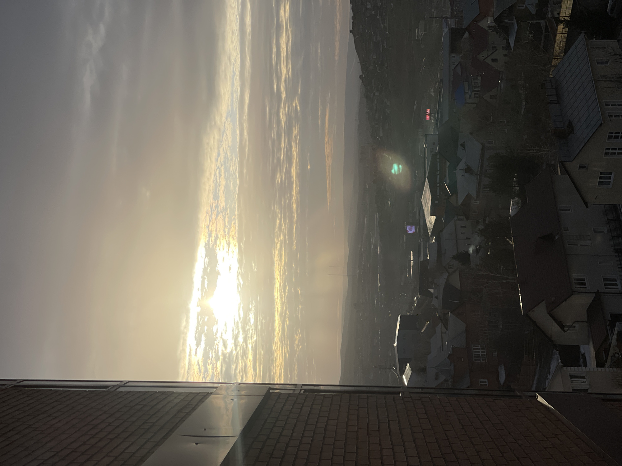 The image displays an elevated view of a city, identified as Krasnoyarsk, Russia, at what appears to be sunrise or sunset. The sun, a brilliant disc, is positioned low in the sky towards the left, partially veiled by scattered clouds, emitting strong golden light and visible crepuscular rays. A prominent lens flare artifact is present in the lower center-right of the frame. In the immediate foreground on the left, a section of a modern building is visible. It features a dark brown/red brick facade and vertical reflective panels. The urban midground consists of a dense arrangement of residential and commercial structures. Numerous houses with various pitched roofs (dark red, grey, blue) are prominent, with visible patches of snow on some roofs and ground areas, suggesting a cold season. Interspersed among the buildings are bare deciduous trees. Larger, darker commercial or industrial buildings are also present; one in the mid-right exhibits a distinct green/teal circular lens flare artifact. A red rectangular light source is discernible further right amidst the urban sprawl. The background features a hazy range of distant hills or mountains, dotted with sparse buildings on their slopes. Two slender, tall structures, possibly communication towers, stand against the distant landscape to the left of the image center. The sky is predominantly cloudy, transitioning from a bright golden hue near the sun to a muted grey towards the top and left. No human figures or discernible activities are present.