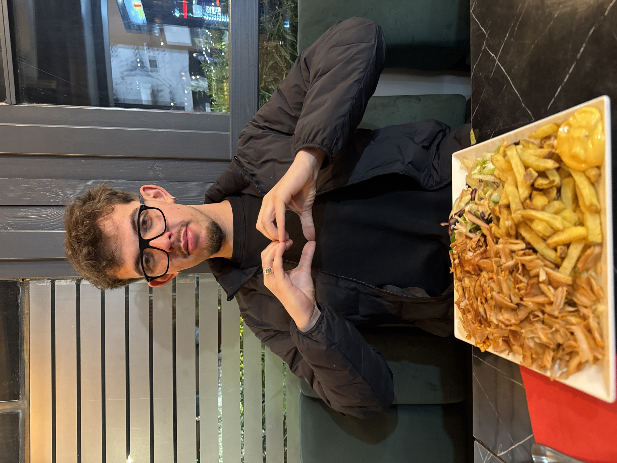 A young adult male is seated at a dark, marbled table in a restaurant in Les Ulis, France. He has light brown, curly hair, wears black-rimmed glasses, a black t-shirt, and a black puffer jacket. A short beard and mustache are visible, along with a silver ring on his left ring finger and a silver hoop earring in his left ear. He faces the camera directly, forming a heart shape with both hands held in front of his chest. On the table, a large white rectangular plate holds a meal consisting of sliced meat (likely döner/kebab), French fries, a small side salad of mixed greens and red cabbage, and a portion of yellow sauce. A red napkin or cloth is positioned to the left of the plate. The background features dark green upholstered booth seating and a window showing an outdoor urban night scene with illuminated buildings, streetlights, and blurred commercial signs. A frosted window section with horizontal slats is visible to the left.