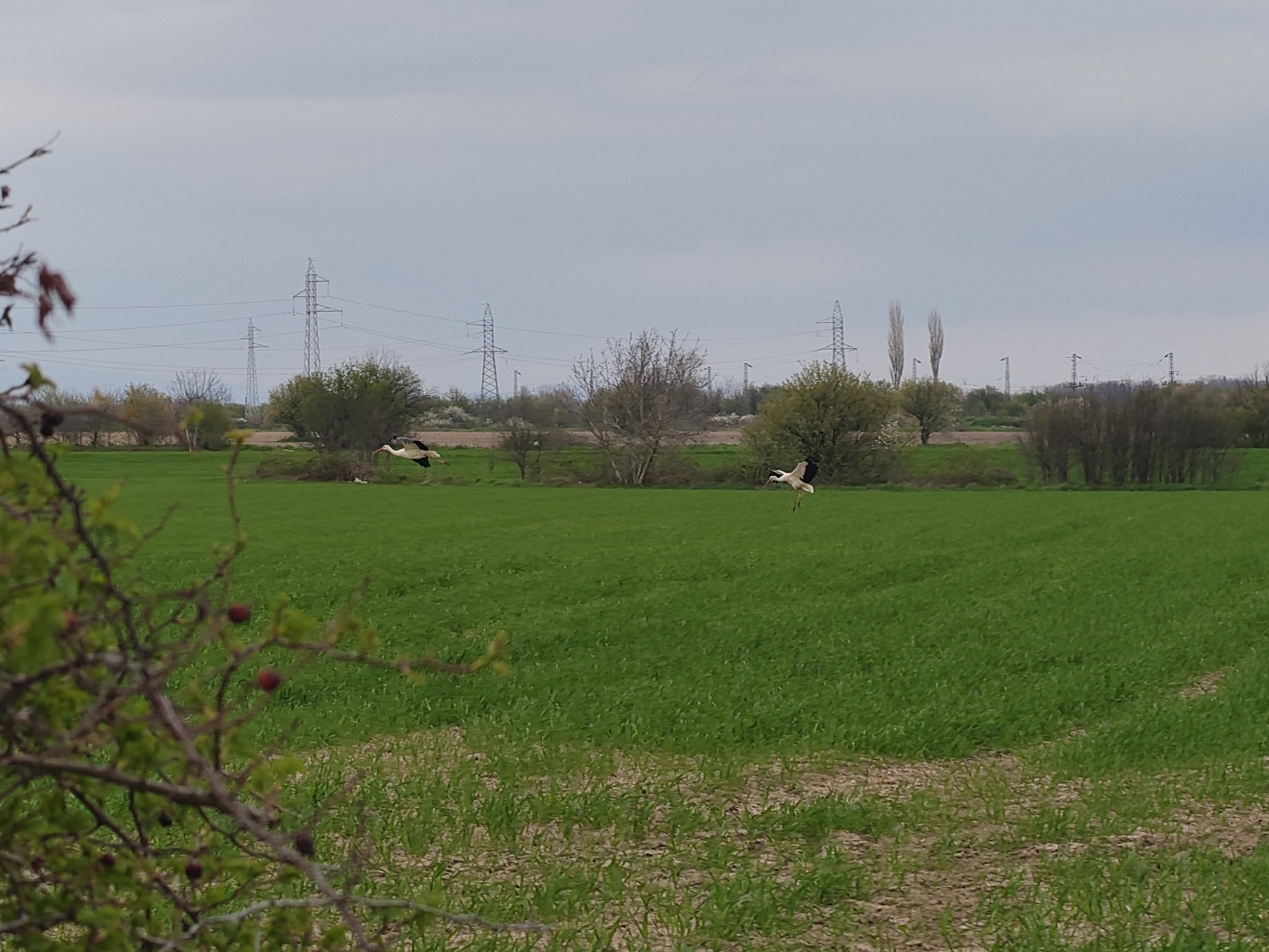 The image depicts a field of green grass with two large birds flying in the foreground. The birds appear to be white storks, with black markings on their wings. In the background, there are several trees and bushes. Beyond the trees, there are electrical pylons visible against a cloudy sky. A leafy branch with some red berries is in the left foreground. The ground in the lower part of the image shows areas of bare soil mixed with sparse vegetation. The location is Unknown, Unknown.